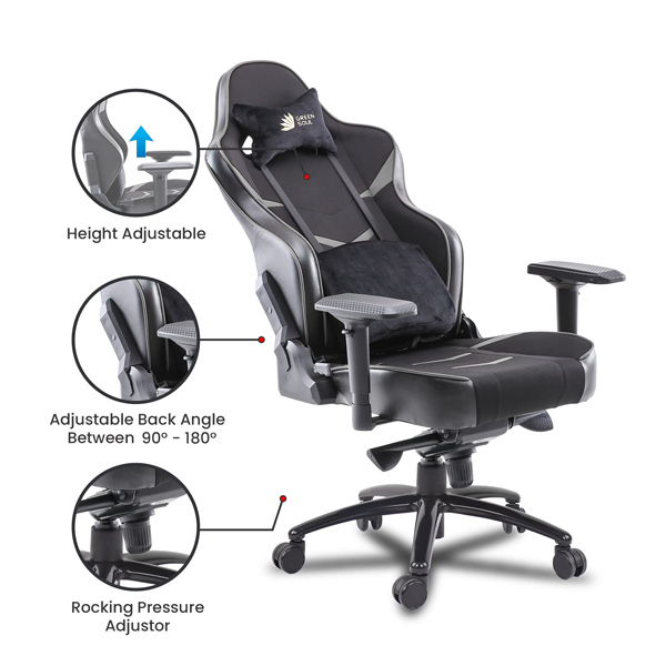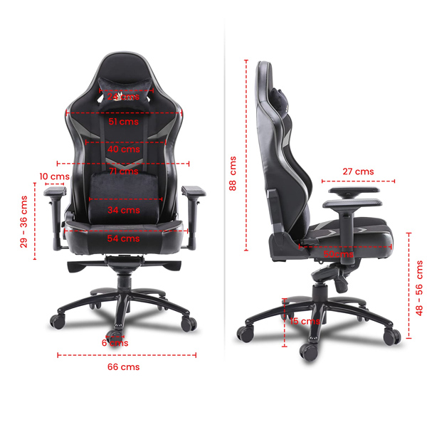 TECH SPECIFICATIONS: Internal Frame Material: Metal ● Frame Size: Large ● Upholstery Material: Spandex Fabric + PU Leather ● Neck/Head Pillow: Yes (Velour Material) ● Lumbar Pillow: Yes (Made of Memory Foam & Upholstery - Velour Material) ● Foam Type: Seat made of Molded Foam ● Color: Black & Grey