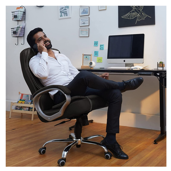 INTEGRATED SUPPORT: This executive chair features an integrated headrest and arms that are Padded for all-day comfort and support with a five-star base that is molded from Reinforced resin with a 360-degree swivel. The Heavy Duty tilt Mechanism allows the Chair and seat to tilt back together up to 135 Degrees, or can be locked at the 90 Degree Position for focused work.